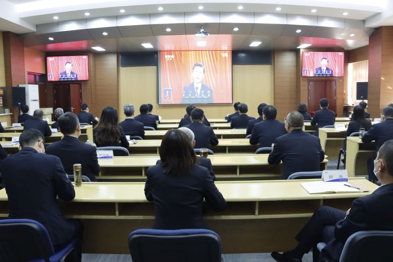 公司領導班子成員,各部門、各單位中層以上干部近50人在主會場觀看,各直屬黨支部委員、子公司黨委近50人在分會場觀看大會直播。